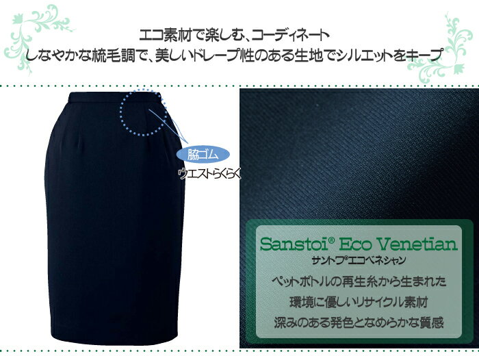 【アンジョア】51076 脇ゴムスカート(60cm丈) 素材 サントワ®エコベネシャン 再生ポリエステルを使用した環境に優しいリサイクル素材 グリーン購入法対応商品 しなやかな梳毛調で、美しいドレープ性と深みのある発色を持ち、素材感はさらっとなめらか 混率 再生ポリエステル57% ポリエステル43% カラー 1.ネイビー サイズ 5号 7号 9号 11号 13号 15号 17号 19号 特徴 ワケあって売れてます!みんなのお気に入り!エコ素材で着心地が良く、そのうえプライスも魅力的! コーディネートで多彩な個性を楽しめます ・グリーン購入法対応商品 使用済みペットボトル等から再生した繊維で作られ、グリーン購入法が基準とする再生ペット樹脂が製品全体重量比で25%以上使用した商品です ・脇ゴム仕様でウエストらくらく! ・左右両方の脇に便利なポケット付き ※ホームクリーニングOK ※生地厚:数が大きいほど厚くなります。