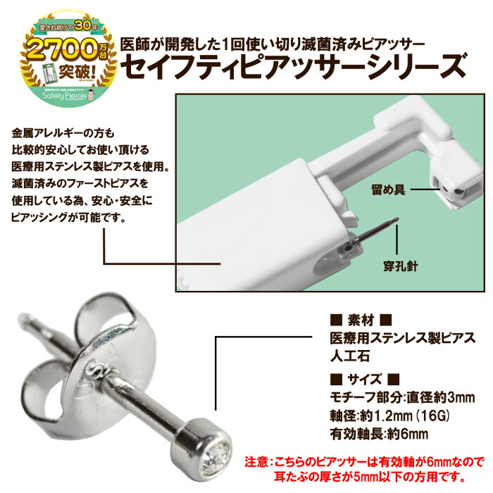 よく一緒に購入されている商品消毒スプレー ピアスを開けた後のアフターケアに800円ピアッサー サージカルステンレス製のファースト880円セイフティピアッサー 16G 片耳用 医療用 1,000円ギフト対応 素材: 医療用ステンレス製ピアス 人工石 サイズ: モチーフ部分:直径約3mm 軸長:16G(約1.2mm) 有効軸長:約6mm ※耳たぶの厚さが5mm以下の方用です。