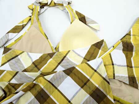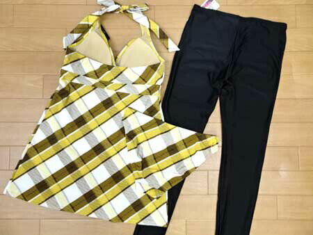 水着 レディース 送料無料 タンキニ 3点セット 9M ワンピース レギンス 体型カバー チュニック 女性用 チェック 黄 9号