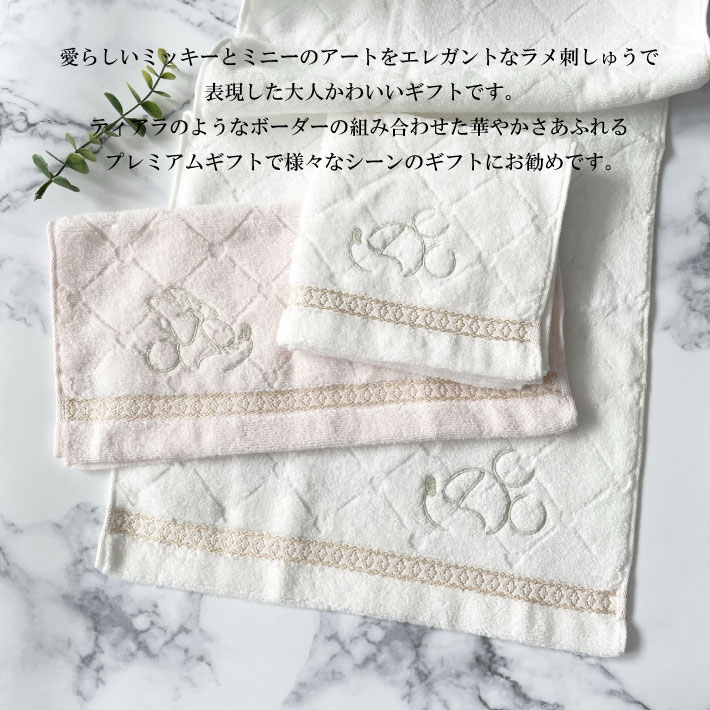 愛らしいミッキーとミニーのアートをエレガントなラメ刺しゅうで表現した大人かわいいギフトです。